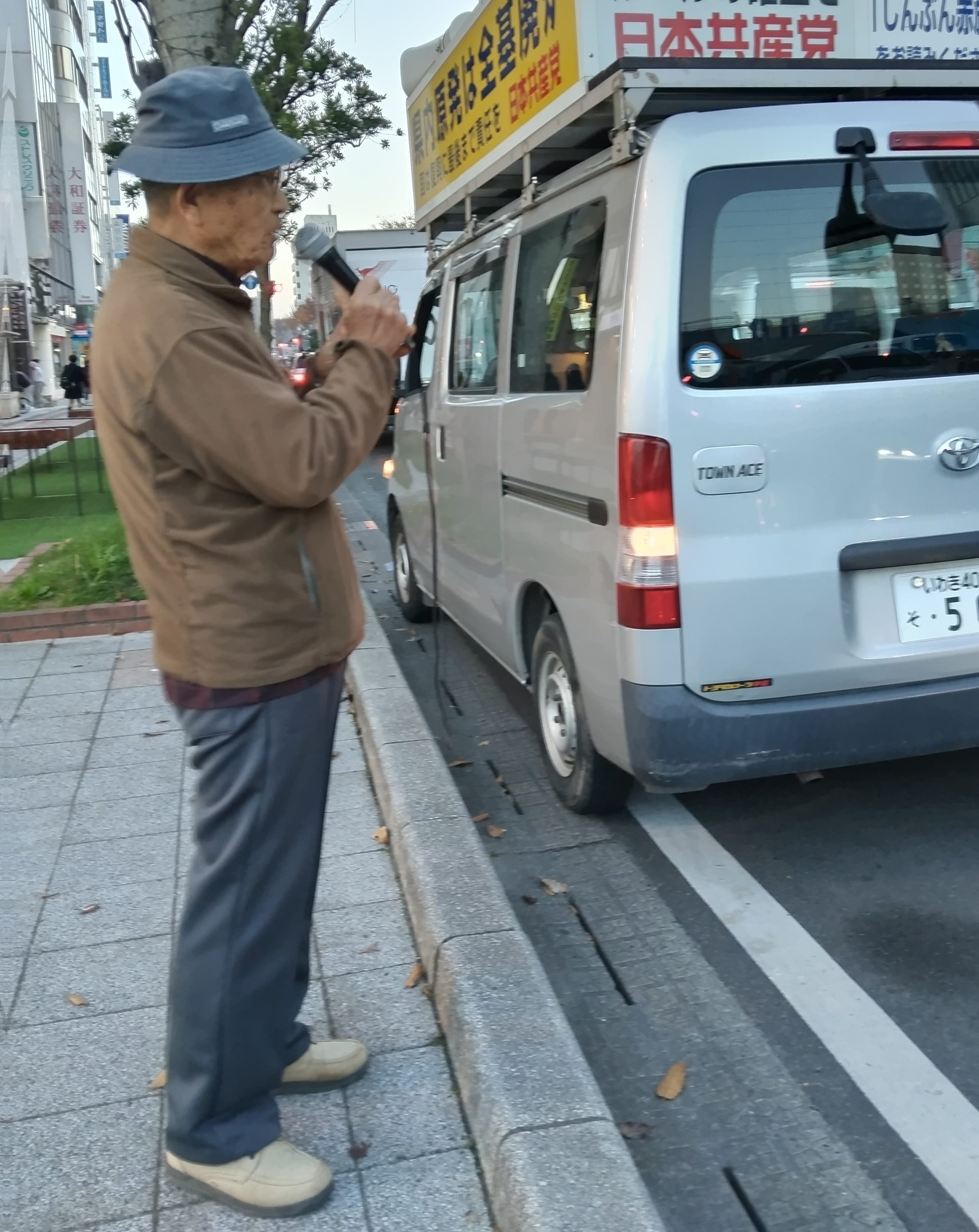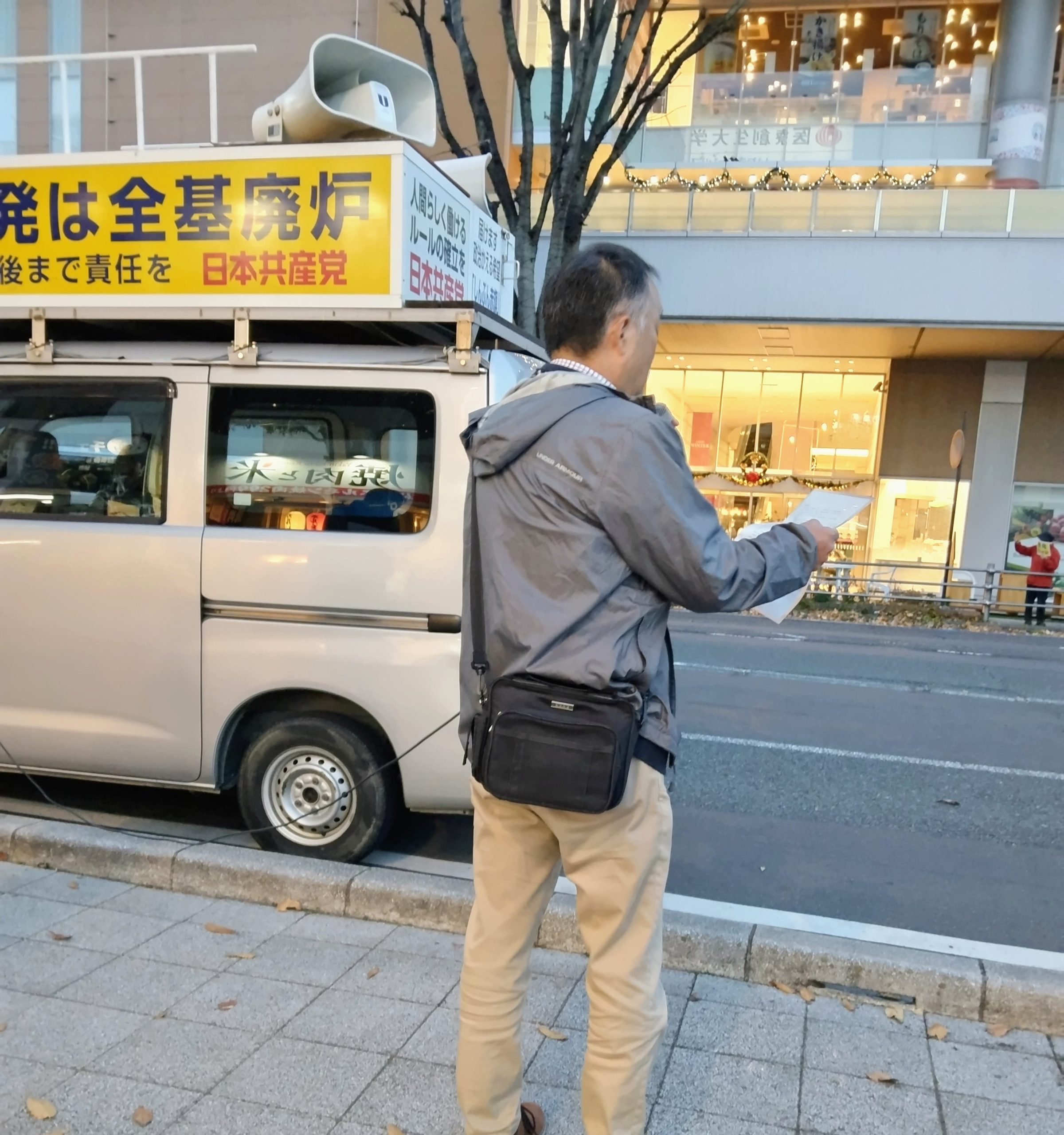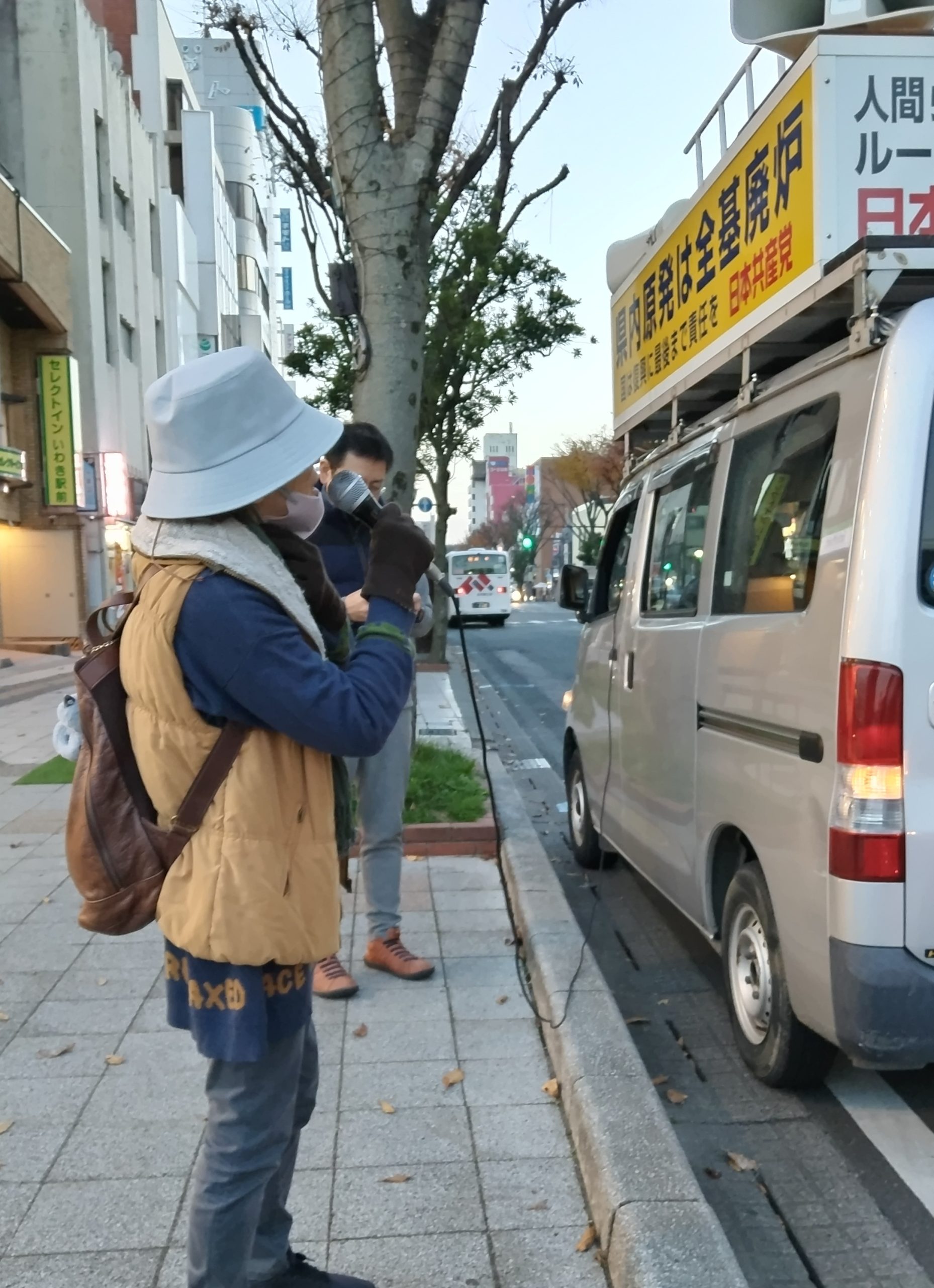 12月1日、柏崎刈羽・泊原発再稼働反対する街宣inいわき駅。今日は4人の市民がリレートークに参加しマイクで訴えました。足をとめていた青年に声をかけたところ、19歳青年でした。