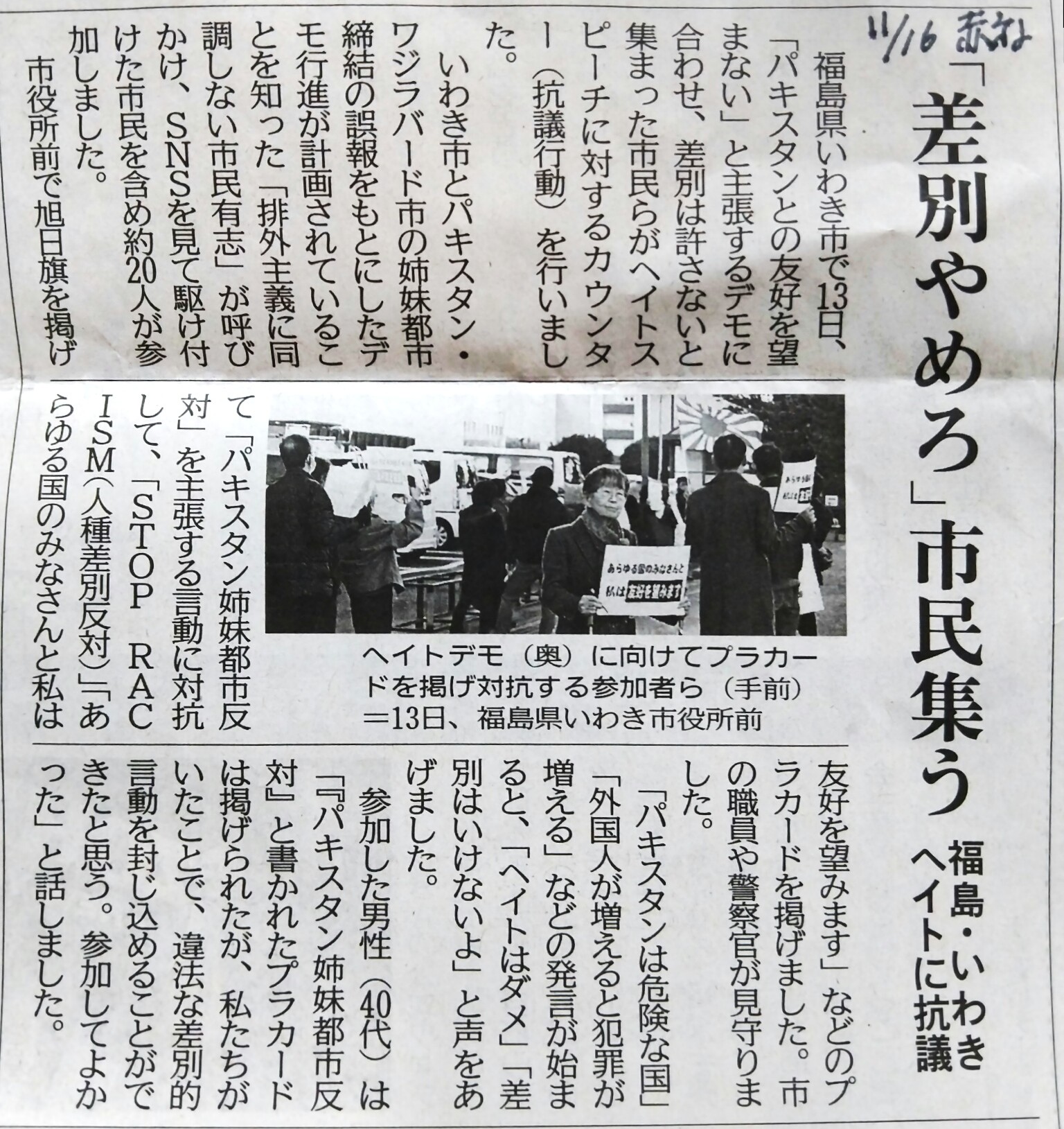 14日、いわき市役所前ヘイトスピーチを許さない思いで対抗!