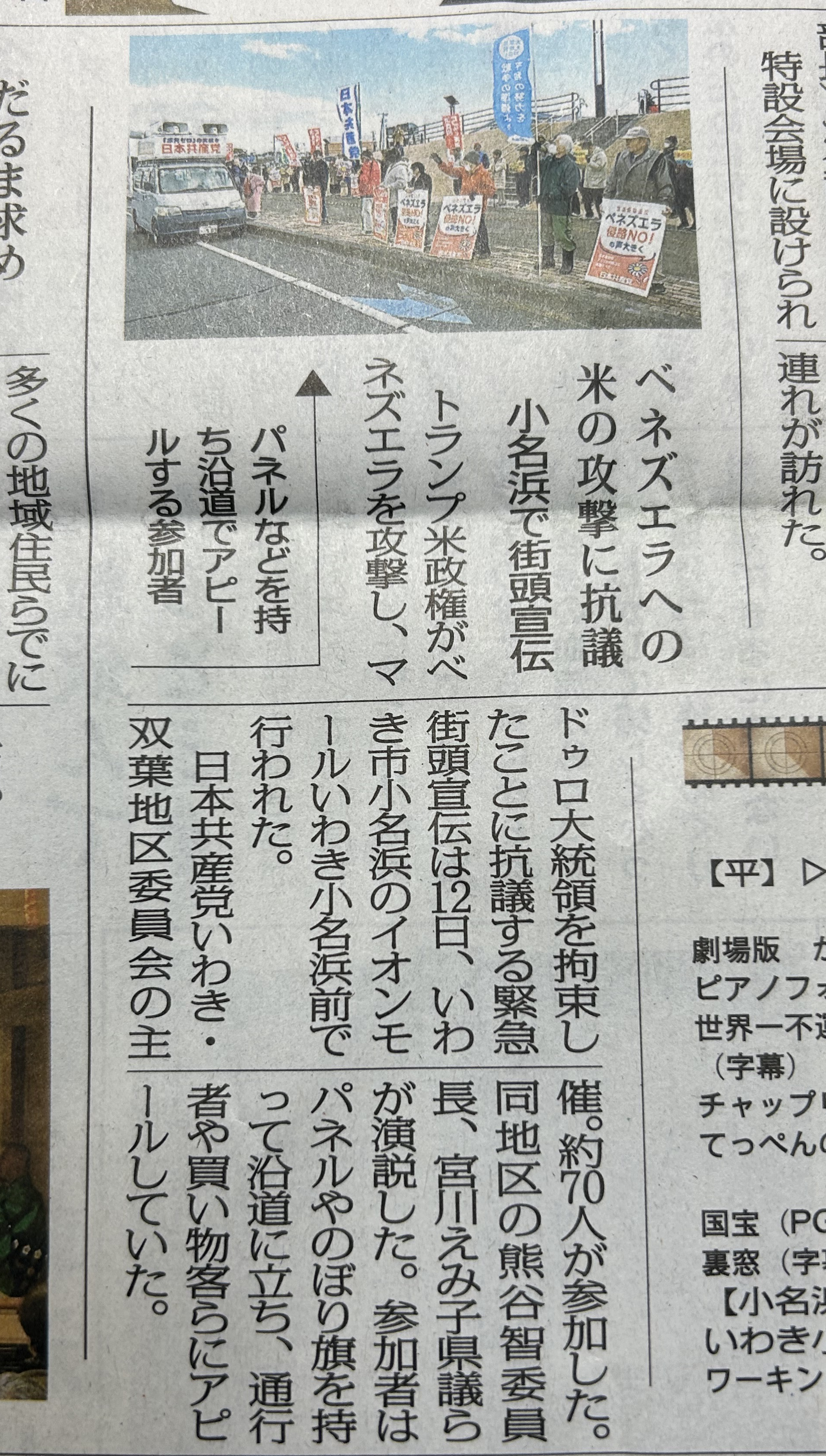 「アメリカのベネズエラ侵略反対!高市首相はアメリカに抗議を」・日本共産党いわき双葉地区委員会緊急行動!