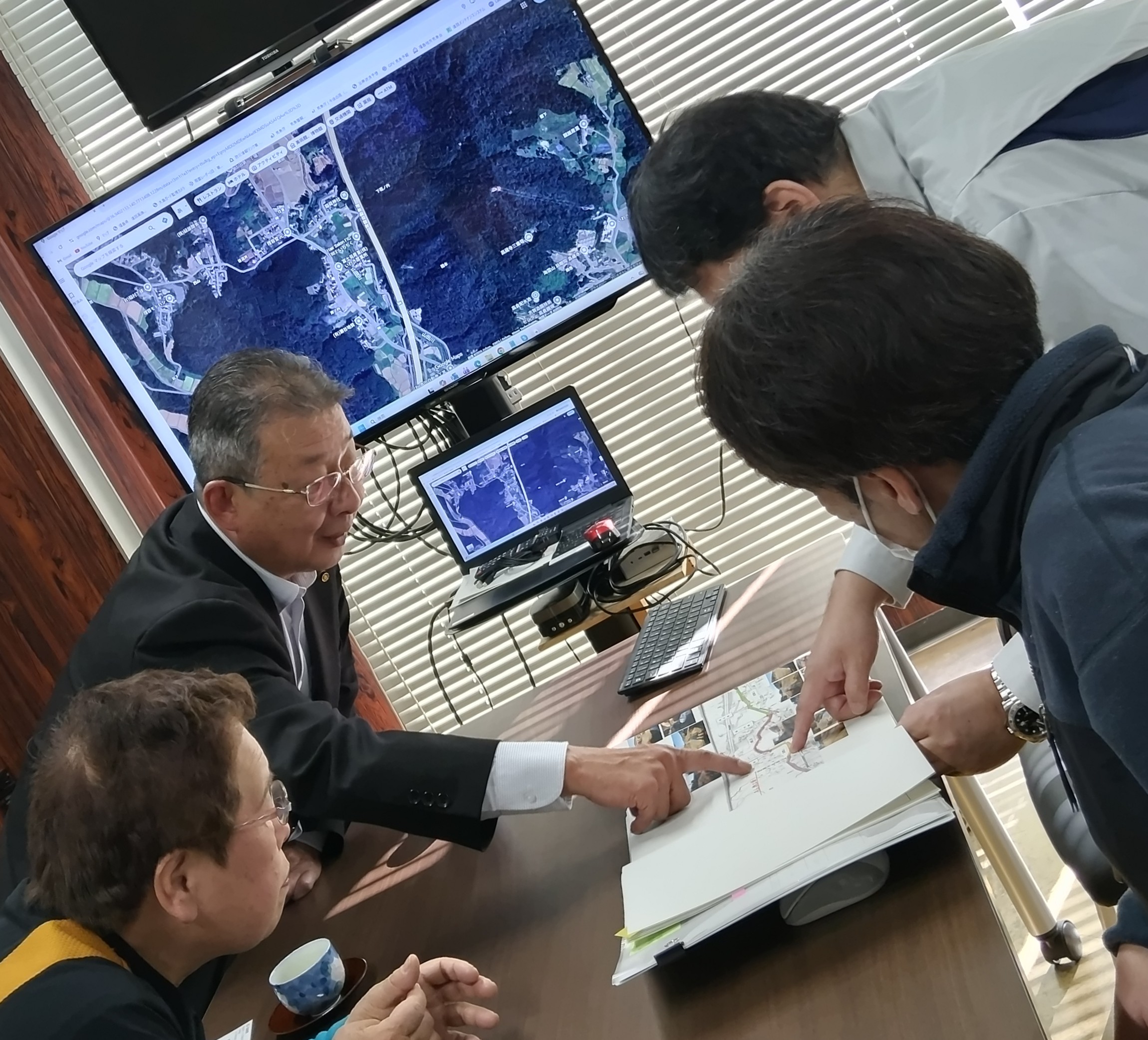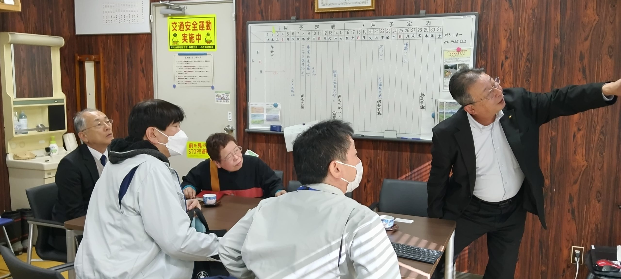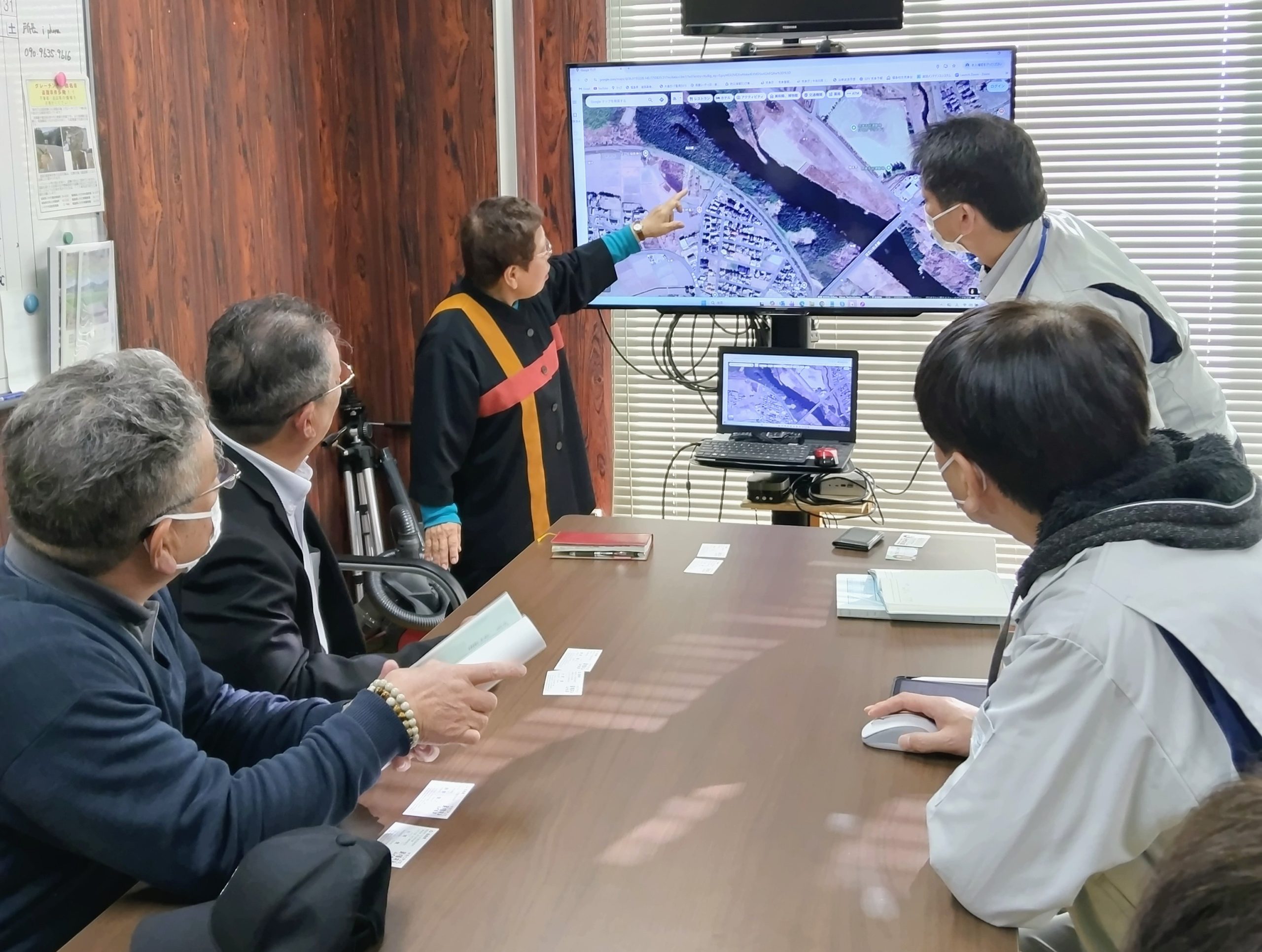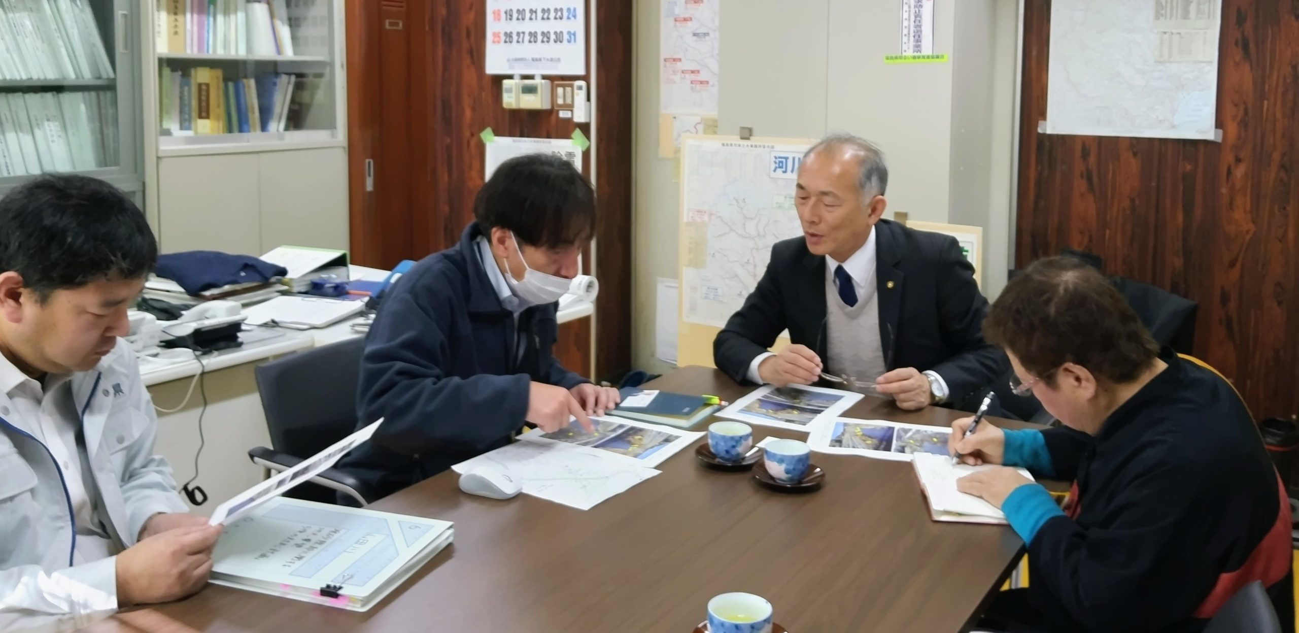 堤防の改修では、シートで堤防を覆うやり方が進んでいますが、堤防利用の草刈り機の出入り等の問題も出てきています。知恵を出し合う事が求められていますね。いわき建設事務所の河川砂防課穀野課長、同片寄係長に対応いただきました。