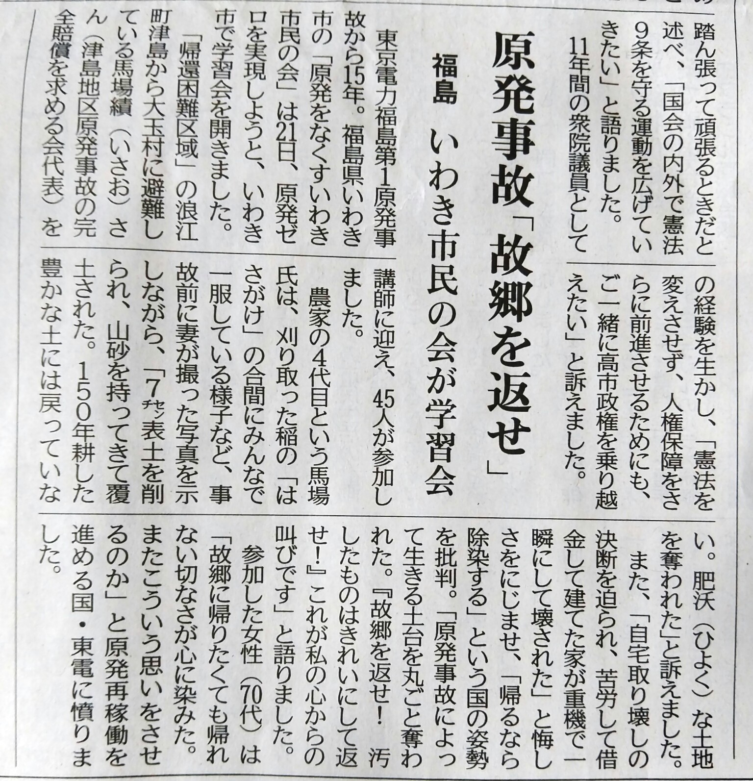21日、いわき市文化センターで原発をなくすいわき市民の会、福島原発事故から15年、ふるさとを失った馬場さんの思いのたけ・・講演