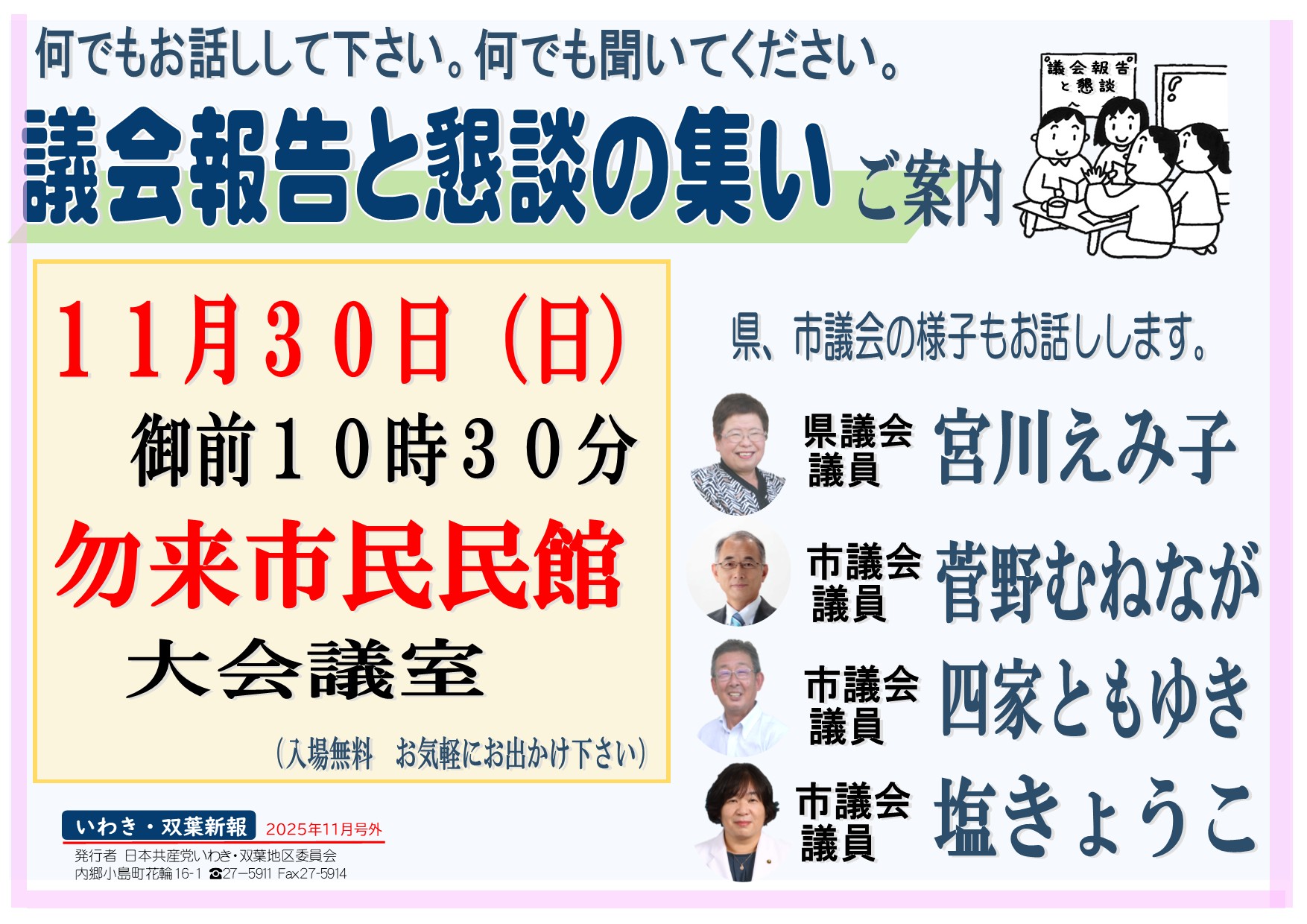 2日、常磐公民館の集いでした。日本共産党いわき双葉地区・熊谷智委員長、菅野・四家市議、私・県議宮川も。それぞれ議会報告後、小池書記局長の記者会見を視聴。