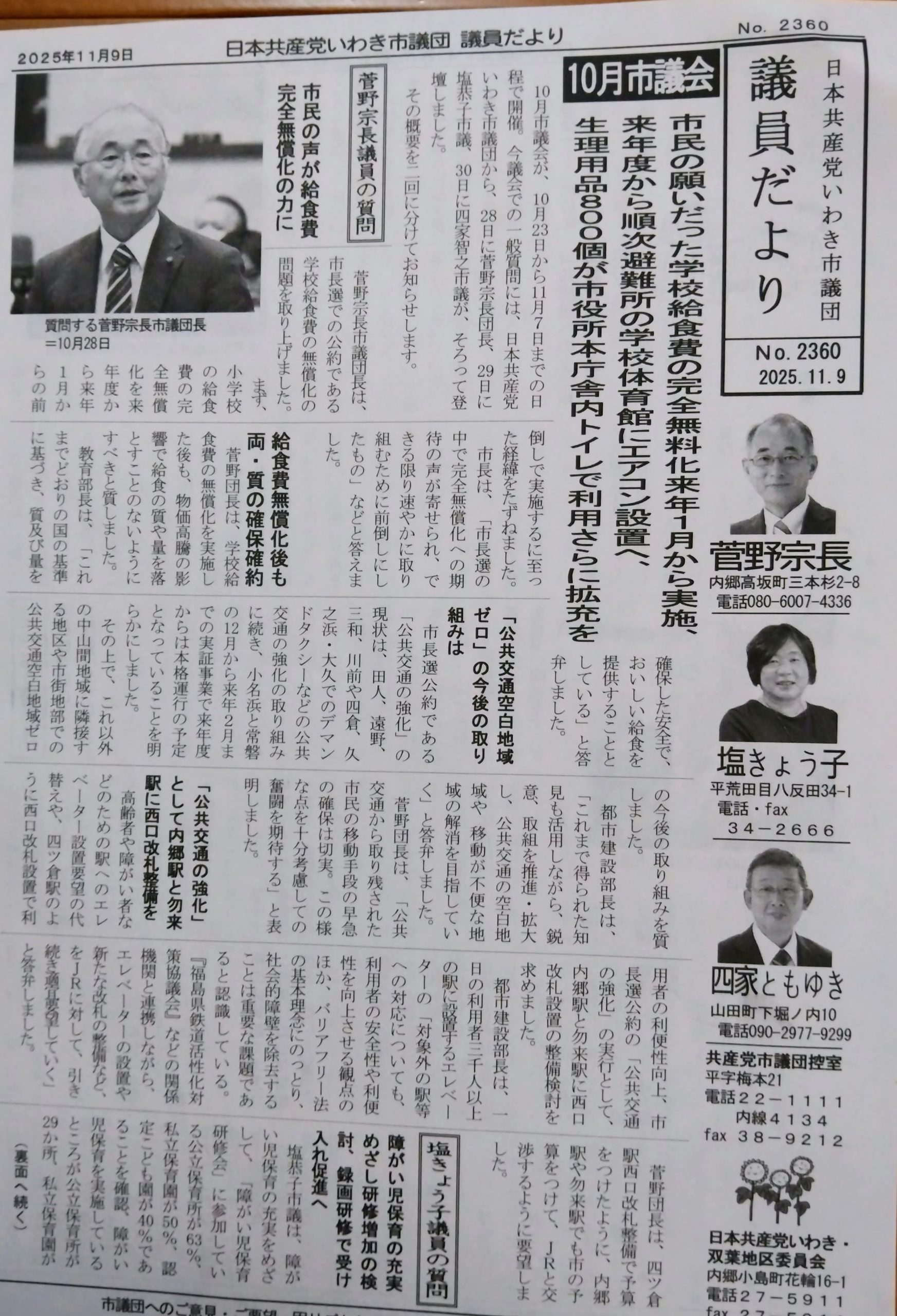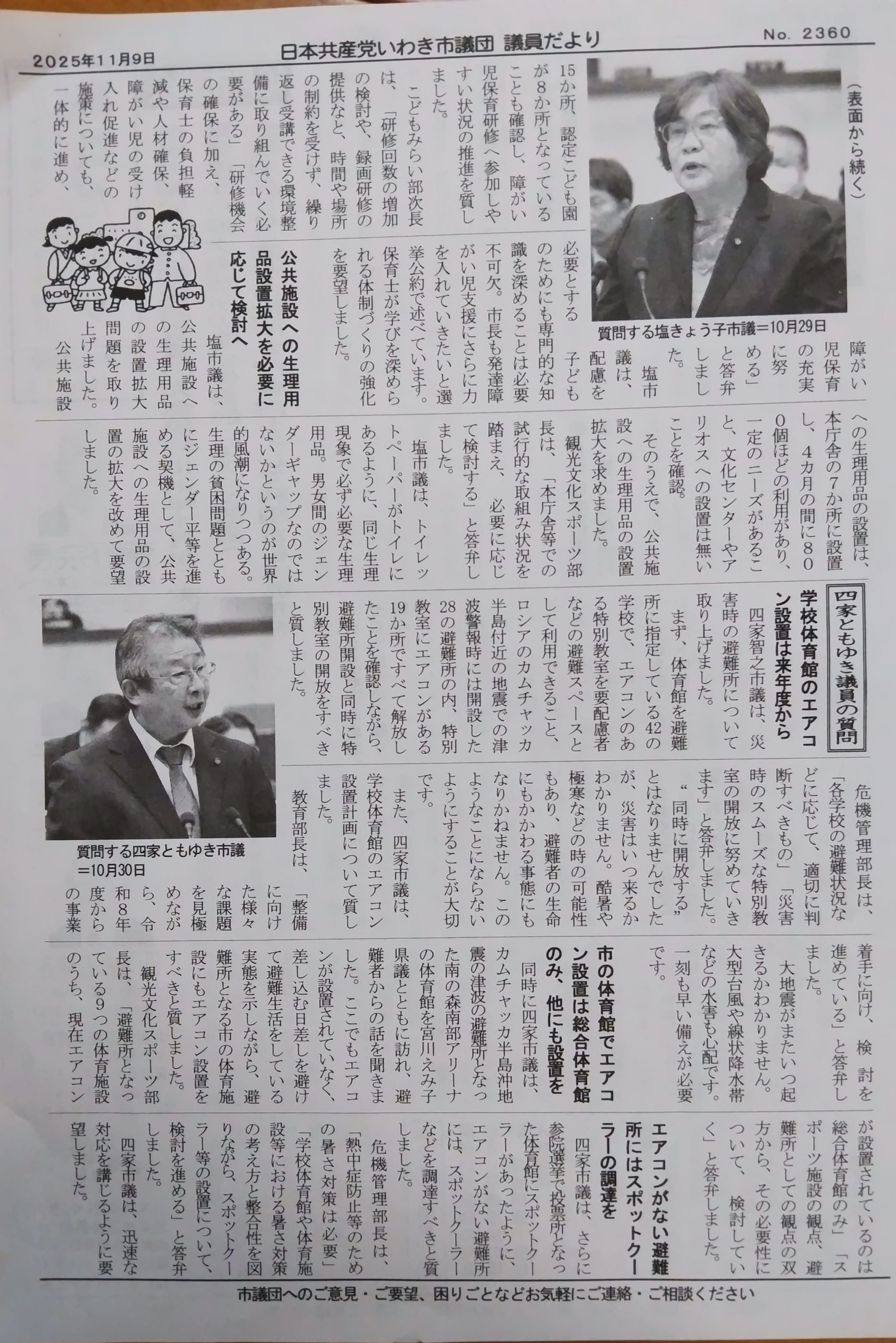 学校給食無償化、公共交通実証実験、公園の草刈り、高齢者等エアコン補助、サッカー場問題、避難所熱中症対策・公共施設学校施設の対策、市道の草刈り維持管理、白線対策に十分な予算を等。