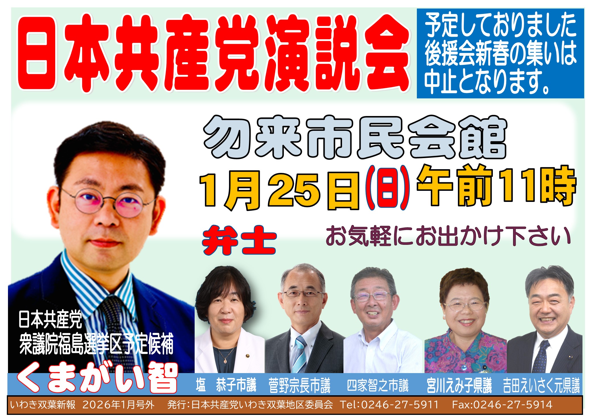 12日、日本共産党いわき双葉地区委員会は「アメリカのベネズエラ侵略反対!高市首相はアメリカに抗議を!」と、小名浜イオン前で緊急行動を行いました。緊急にもかかわらず80人が集まりました。熊谷地区委員長、県議、市議などの訴えに続いて、市民の皆さんも飛び入りの抗議の訴え。また若い方も飛び入りで戦争反対をアピールしてくれました。