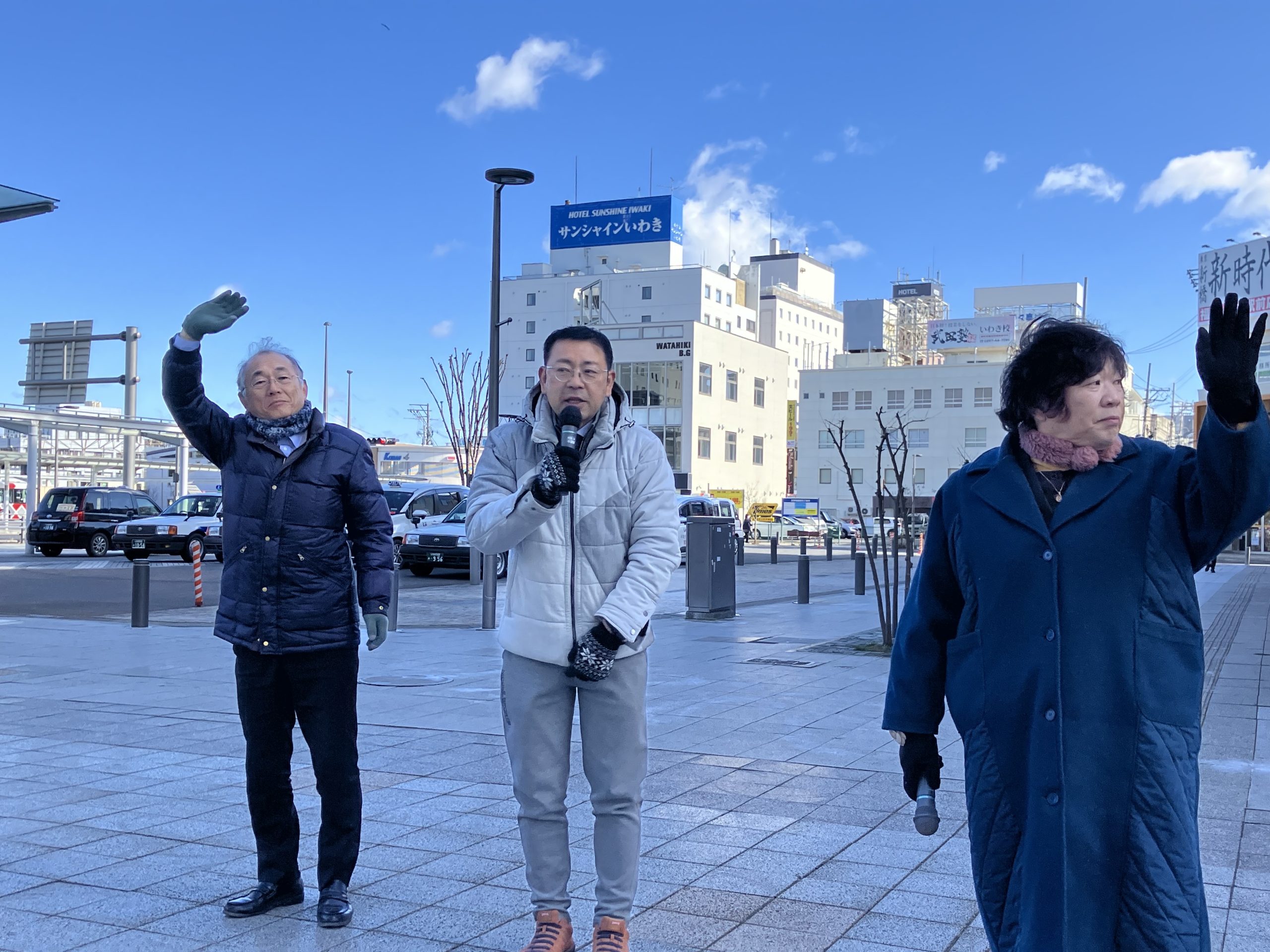 自民党政治と対決する旗を掲げ、憲法を真ん中にした県民的共同をつくってまいります・くまがい智いわき市内街宣。