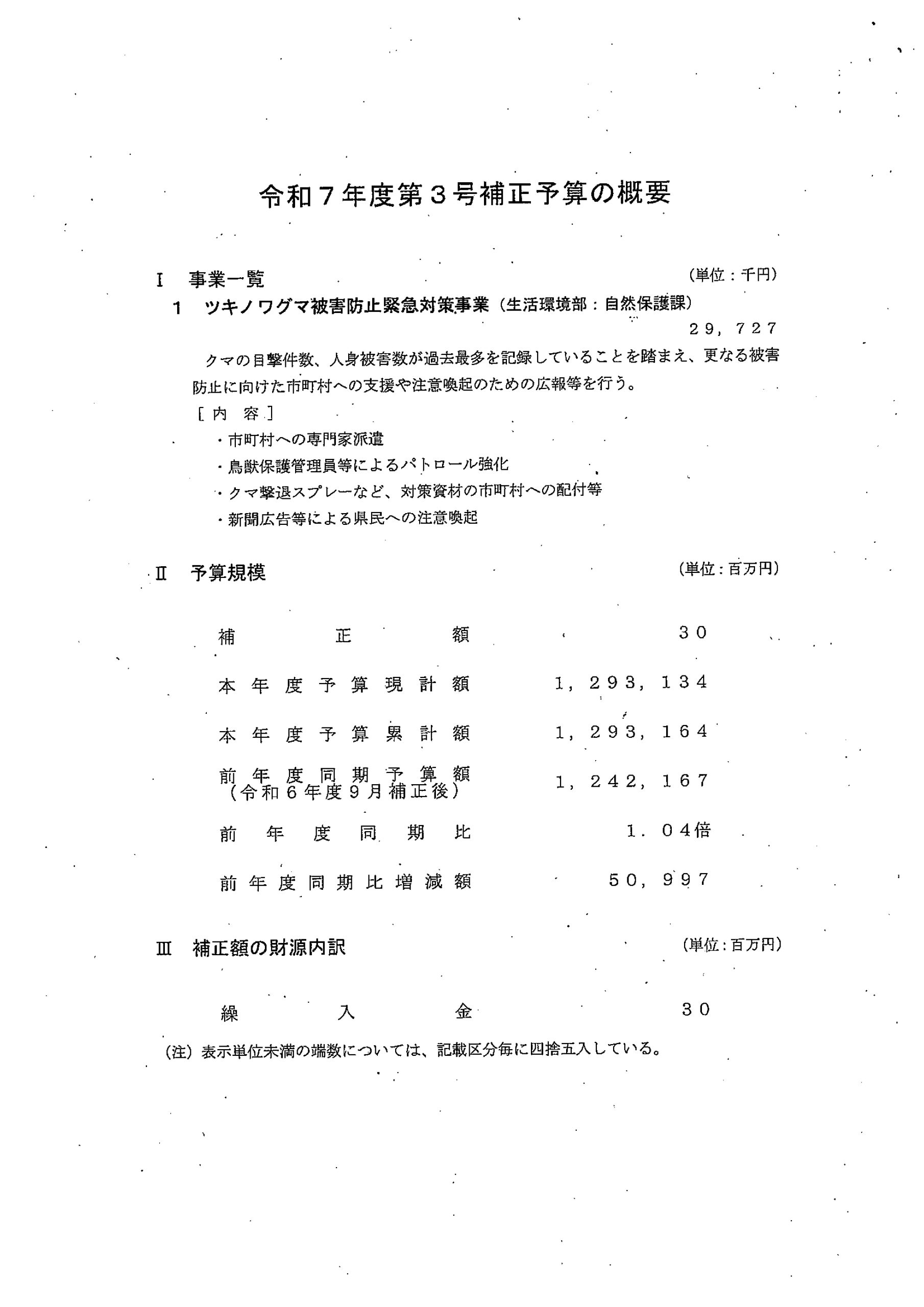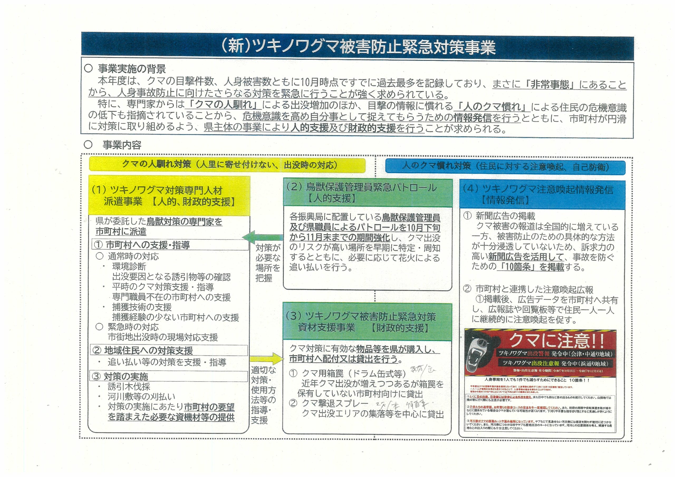 たった3,000万円弱と予算規模は不十分ですが、内容は以下のとおり(添付資料参照ください)クマ出没が多発している地域などは、各市町村からのへ働きかけも重要です。