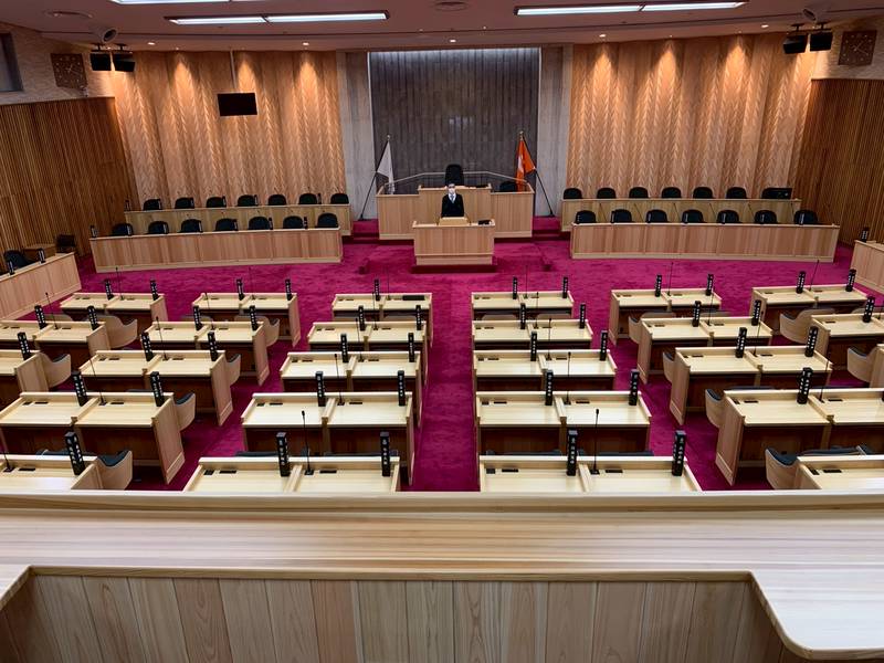 12月2日、大震災で被害を受けた議場が改修されました。議員の出入りが大変だった自席の改修などもできました。12月議会から使えるので改修状況を見ました。自席から左右に出入りができるのでよかったです。