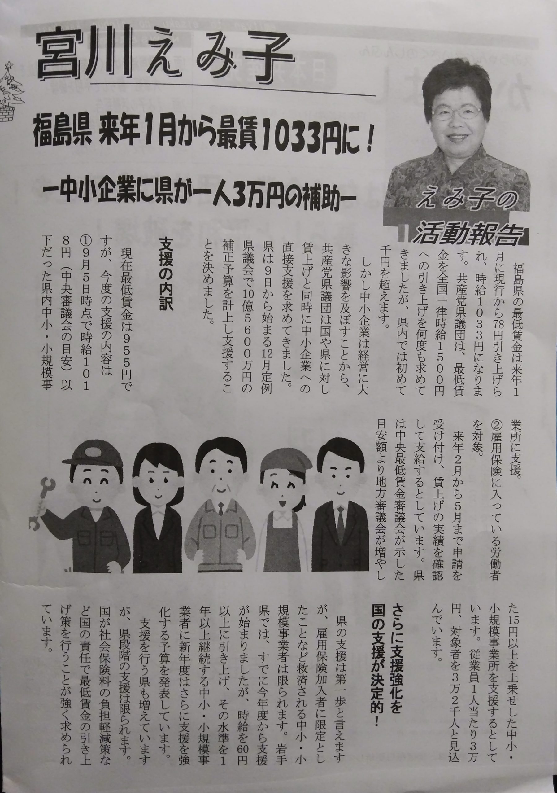 福島県の最低賃金は来年1月に現行から78円引き上げられ、時給1033円になります。共産党県議団は、最低賃金を全国一律時給1500円への引き上げを何度も求めてきましたが、県内では初めて千円を超えます。