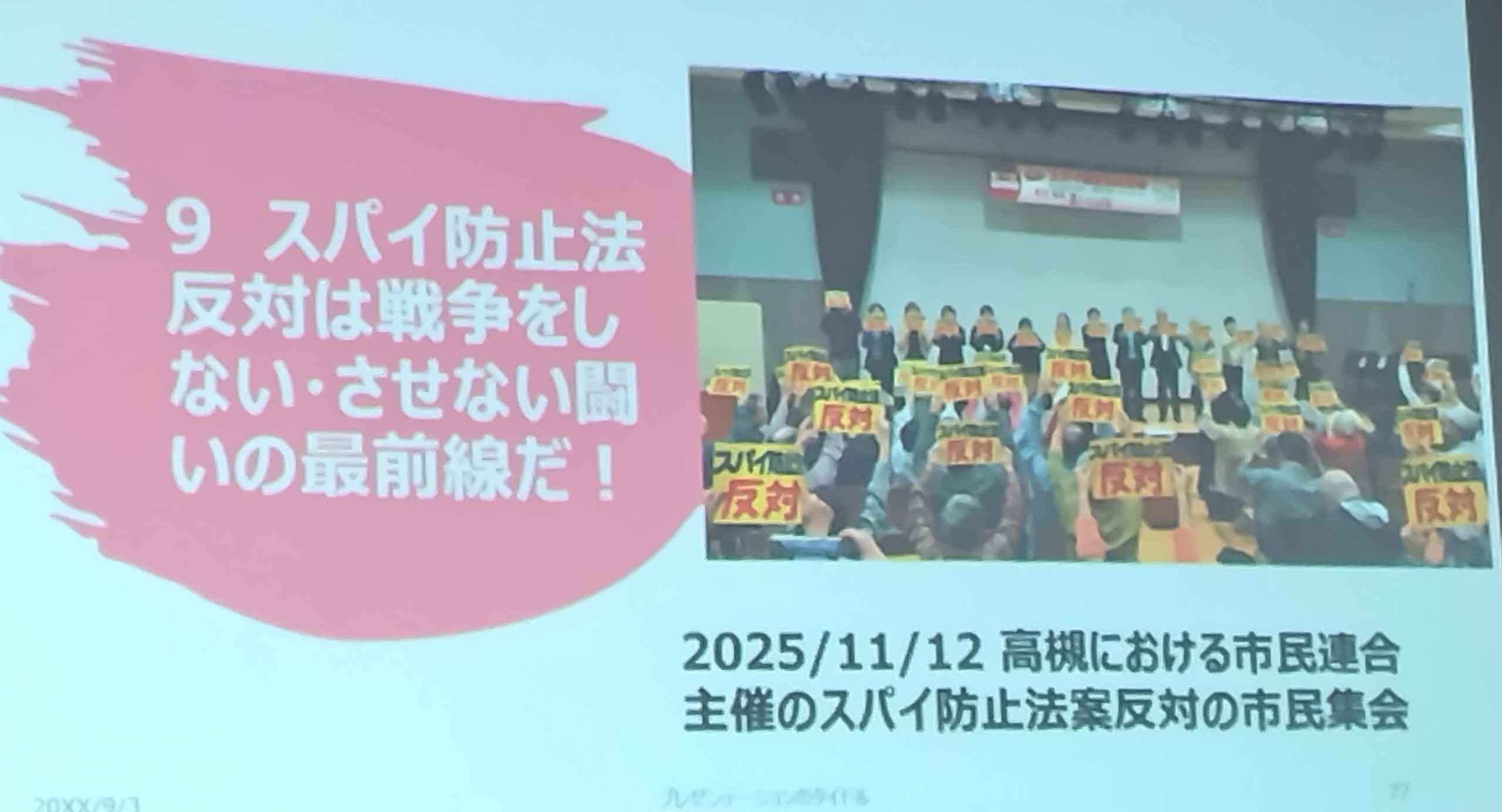 戦前、共産党弾圧が市民の口を塞ぎ戦争に突き進んだこと、スパイ防止法が外国人との交流を「申請制」にして申請のない交流は「スパイ行為」として取り締まりの対象とすること、など非常に勉強になりました。