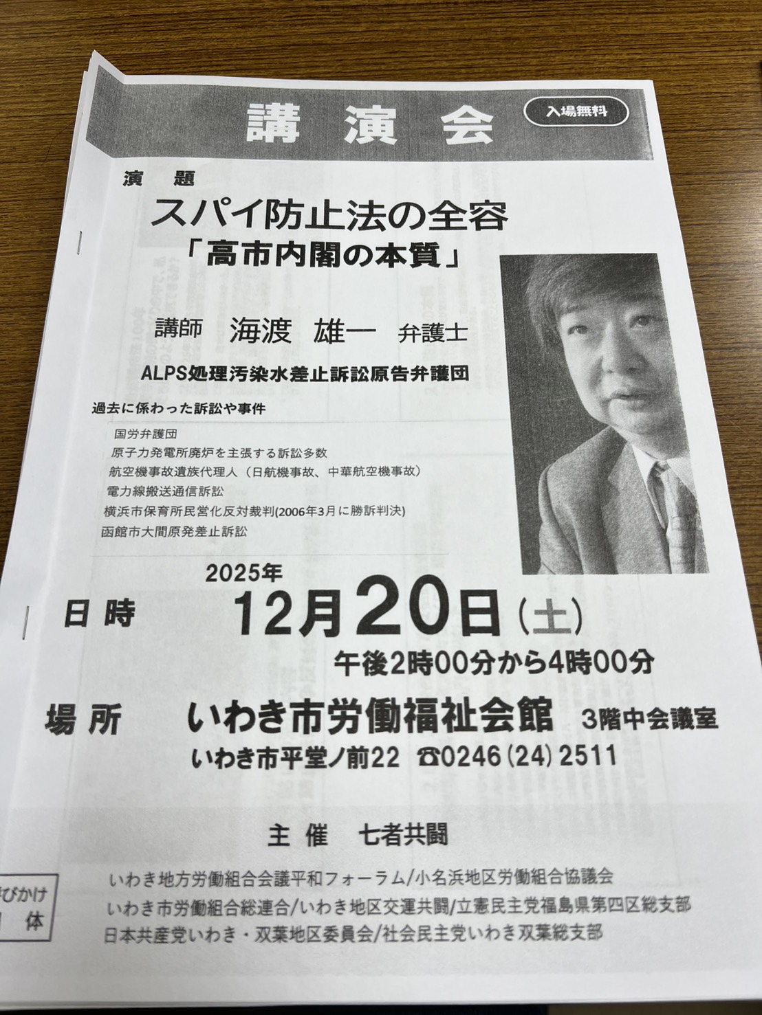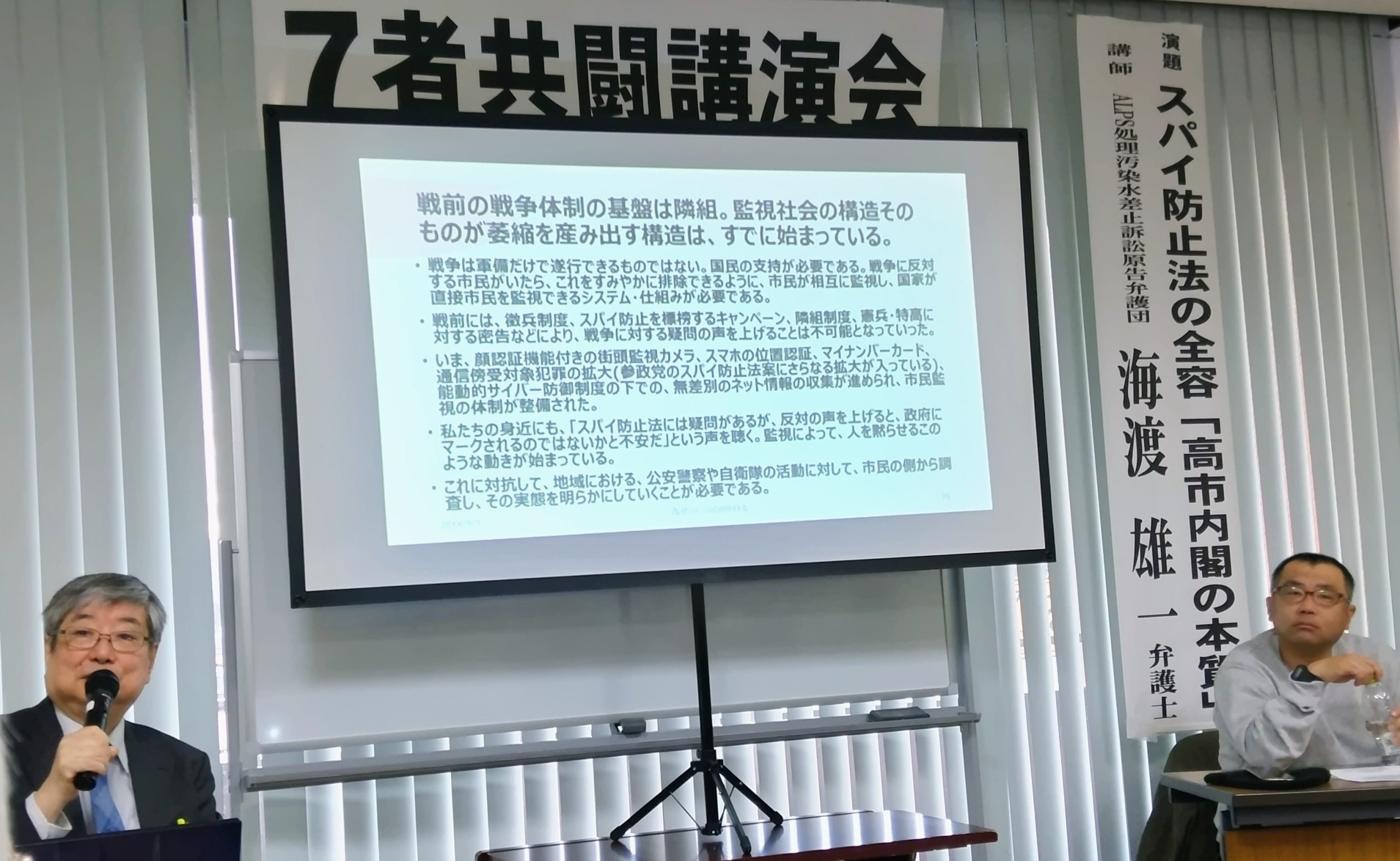 20日、7者共闘で「スパイ防止法の勉強会」海渡弁護士。満員で立ち見も、会場いっぱいの参加で大成功でした。