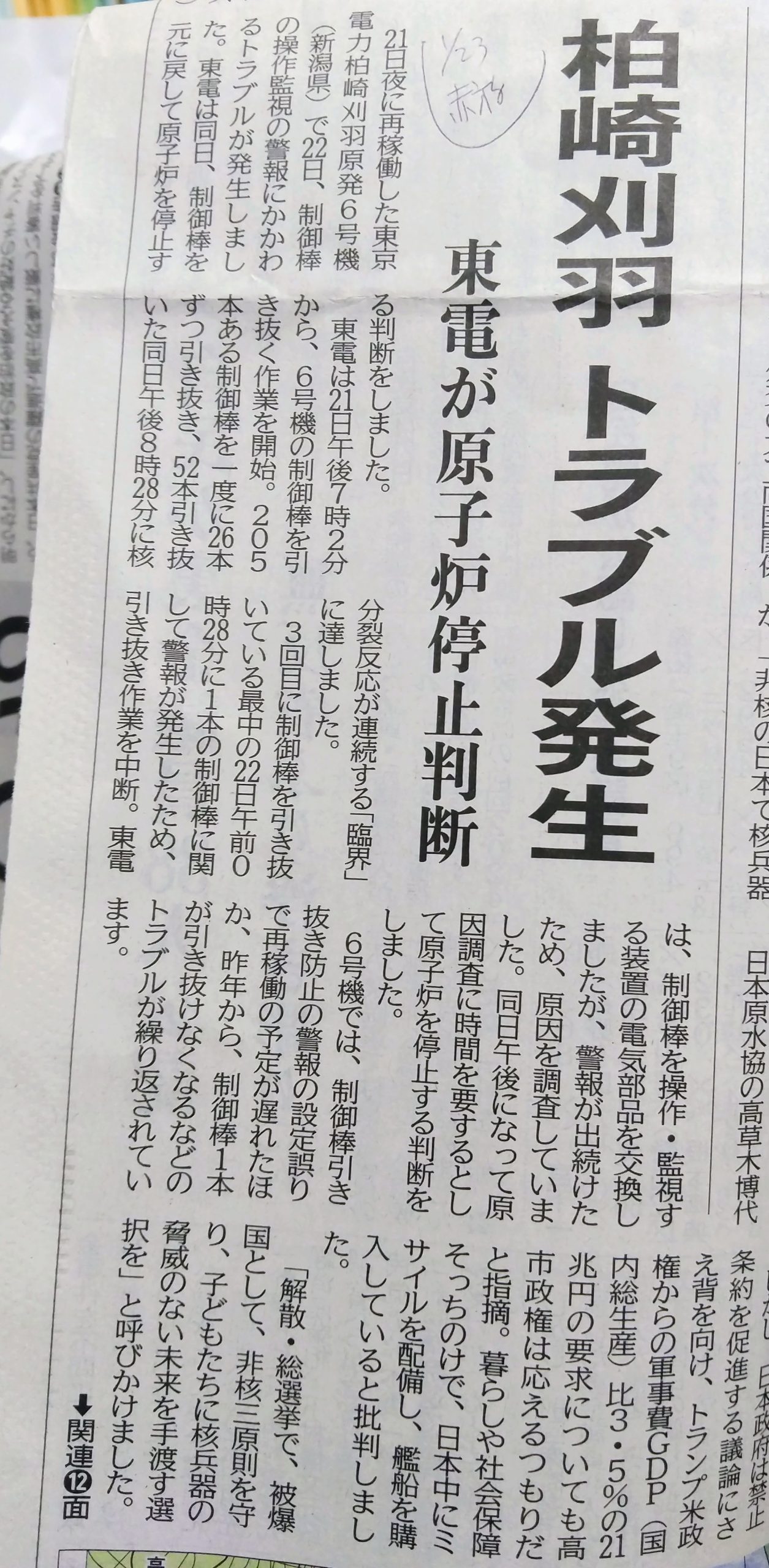 運転直後に柏崎刈羽原発トラブル停止!