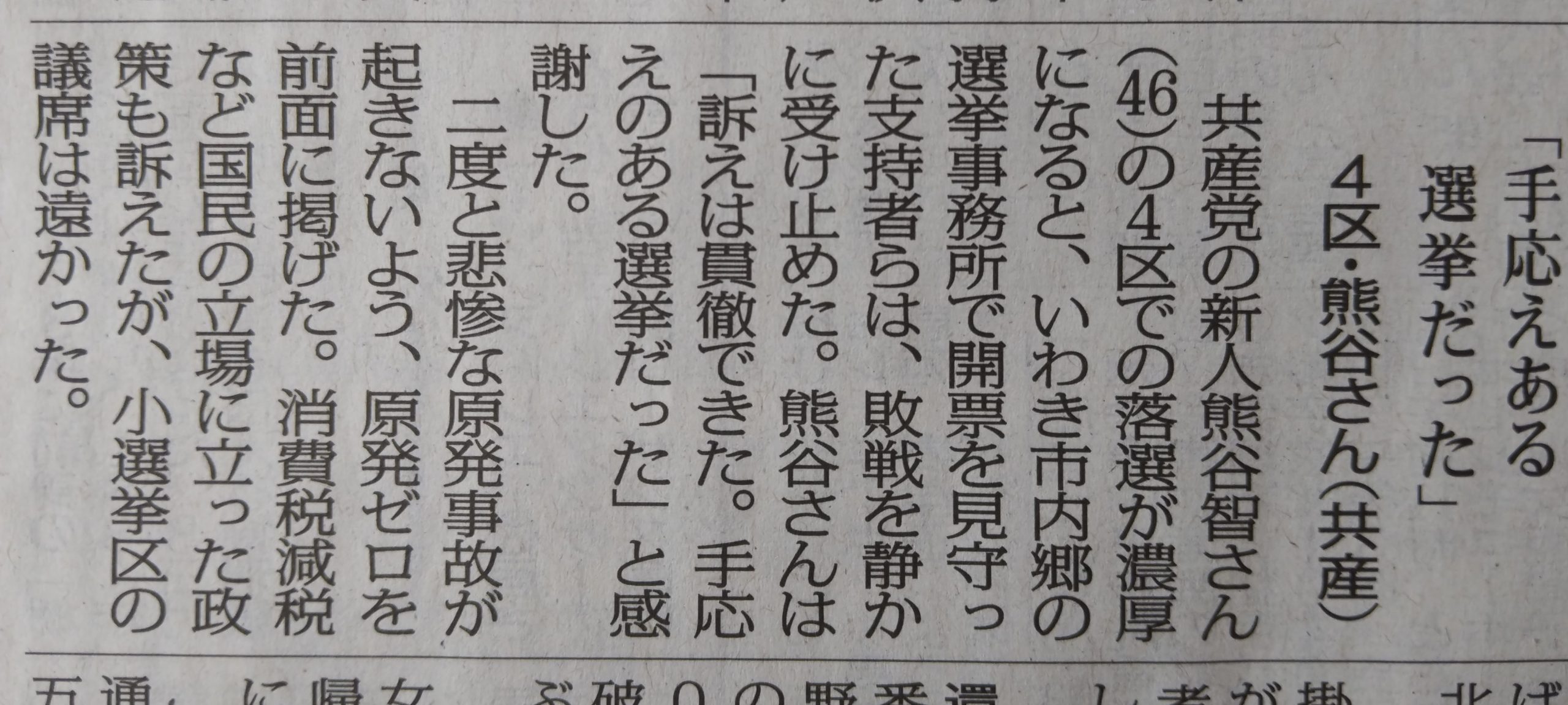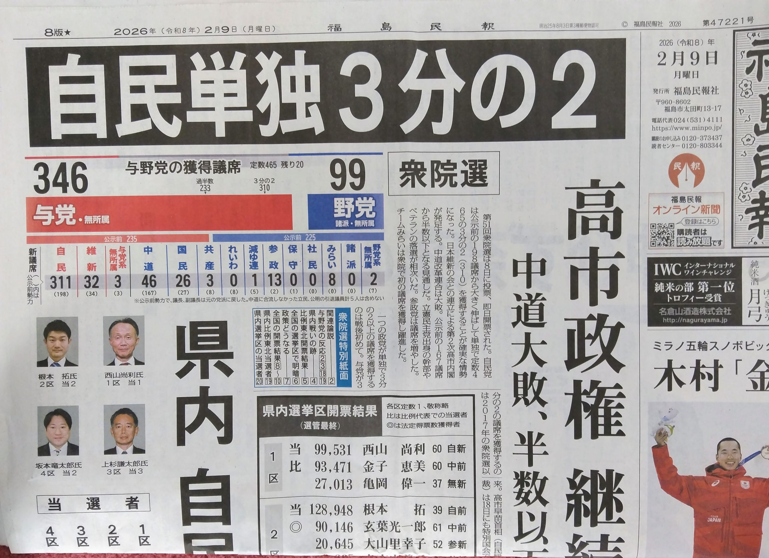 ご支援ありがとうございました。「ママ戦争を止めて見せるわ」で頑張ります 投稿日時: 2026年2月9日 投稿者: emiko.m 8日の選挙結果を受けて、また頑張ります。 (9日福島民報より) DSC_2006 DSC_2006