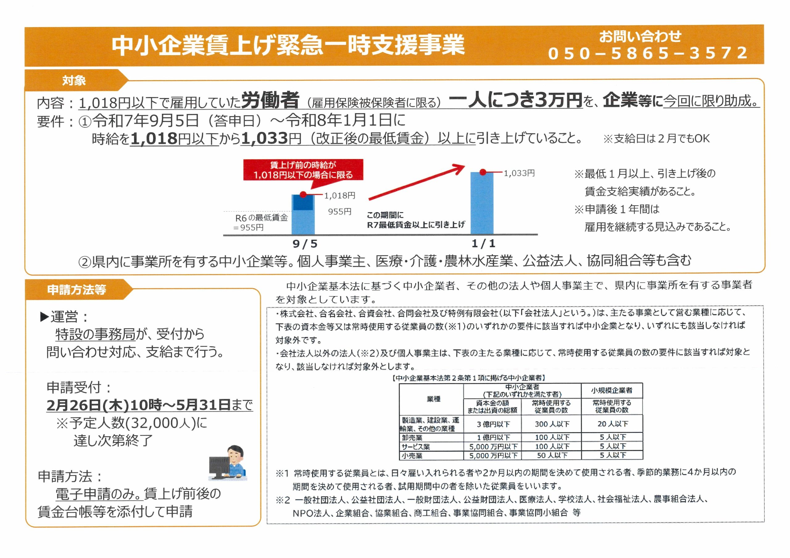 これは不公平・早い者勝ち!福島県の賃上げ支援 投稿日時: 2026年2月28日 投稿者: emiko.m 県の賃上げ支援ですが、よく見ると、申請期間の下に、「予定人数32,000人に達し次第終了」とあります! 補正で予算化した人数に達したら終わるということです。早い者勝ち、これでは不公平