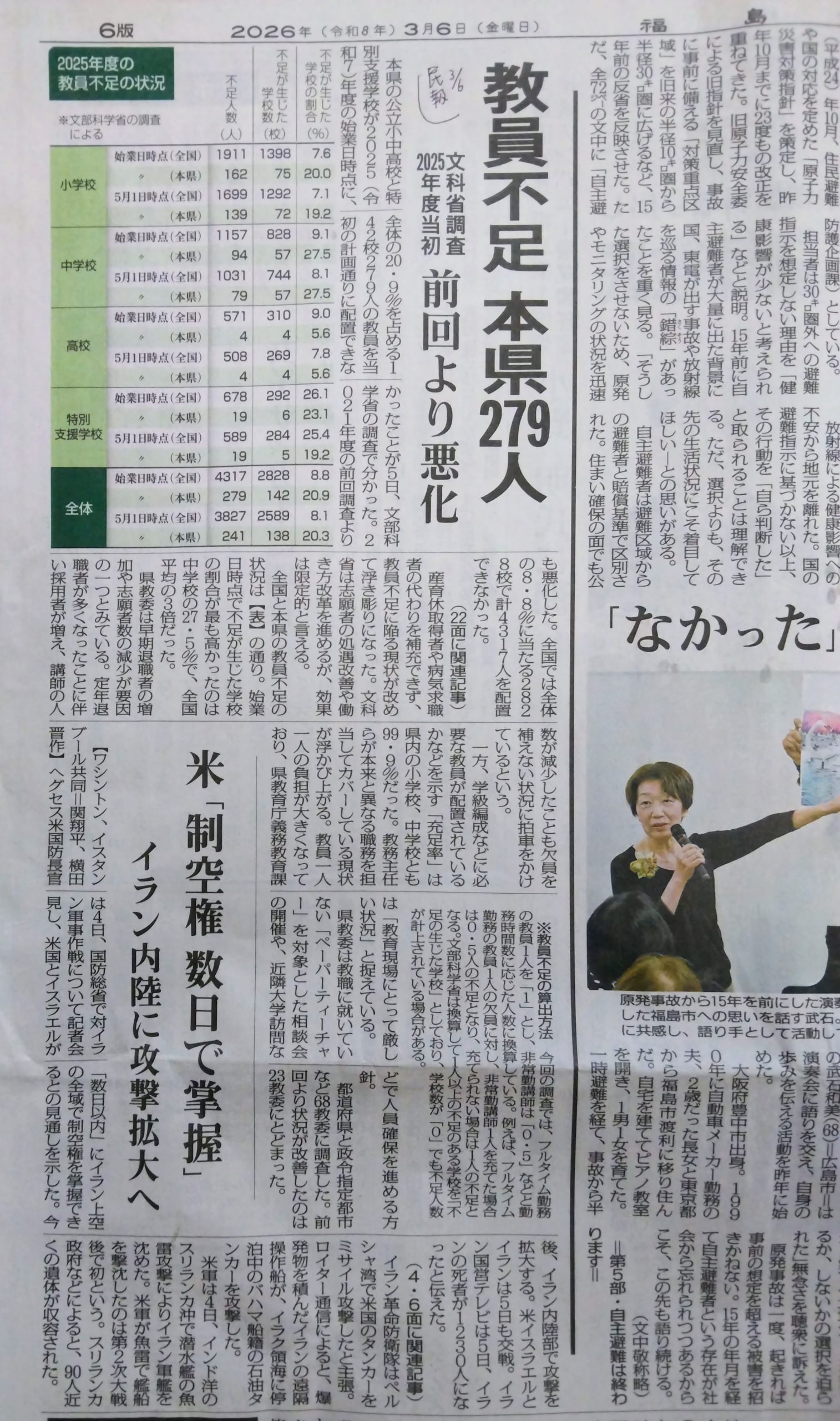 本県の教員不足深刻、福島民報6日付け(始業日時点で不足が生じた割合)全国平均の3倍(中学校) 投稿日時: 2026年3月6日 投稿者: emiko.m 本県の教員不足深刻、福島民報6日付け(始業日時点で不足が生じた割合)全国平均の3倍(中学校)。さる2月10日には、小名浜地区労の皆さんと県・市に要望してました。 DSC_2160