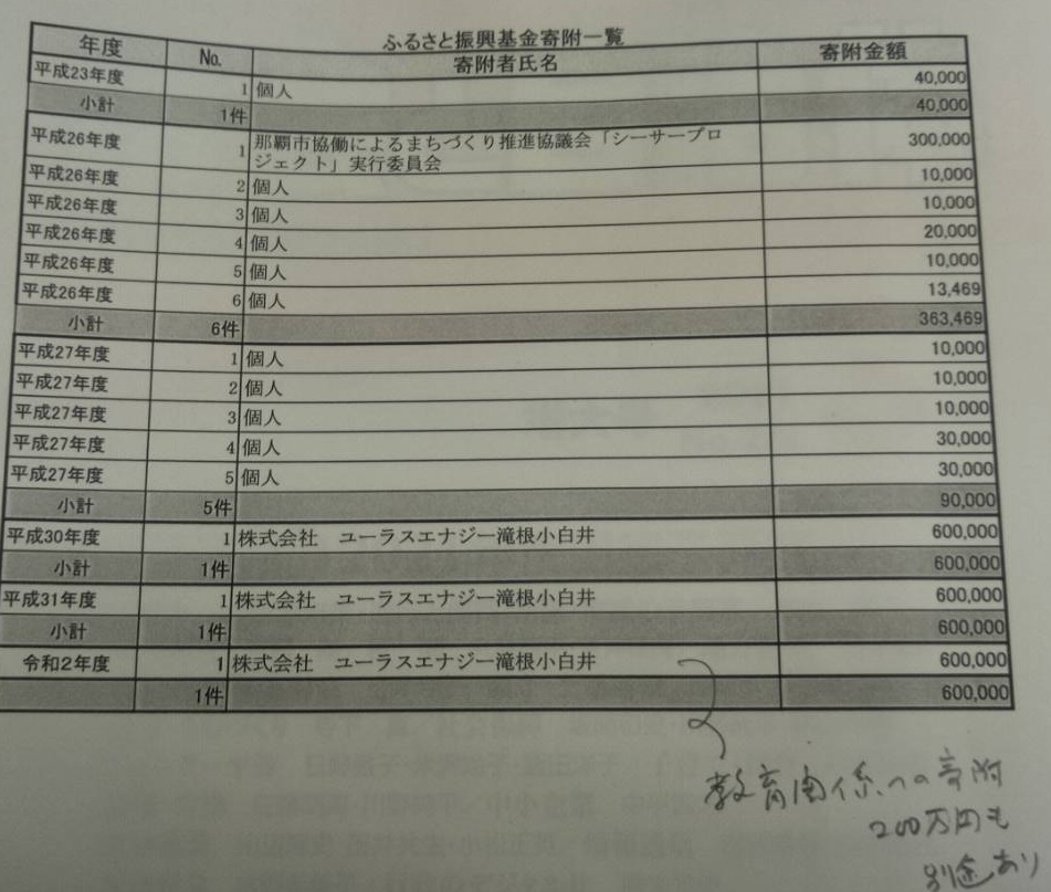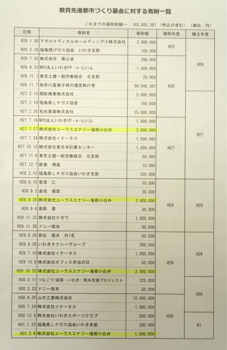 風力発電事業者・ユーラスエナジーの滝根小白井の教育関機関への寄付は、6年前から6回・1020万円、ふるさと振興基金も入れると1200万円です。