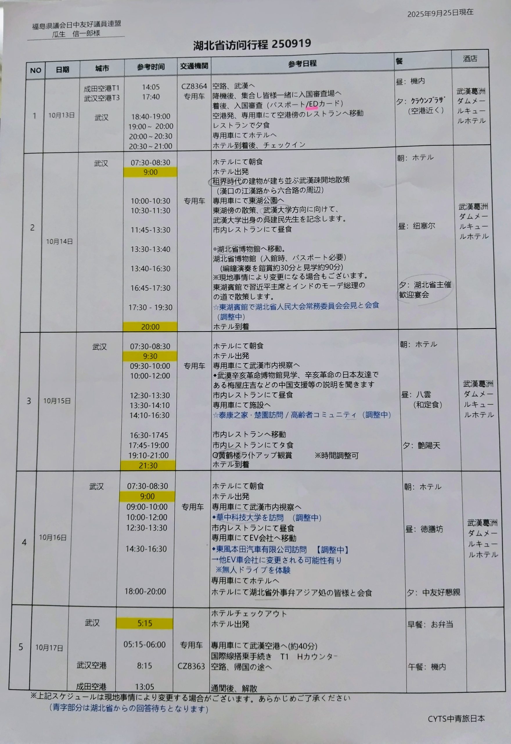 10月13日~17日、超党派で作る日中友好議員連盟は、中国湖北省武漢市を訪問し交流親善を行いました。瓜生会長と湖北省人民代表大会常務委員会・陳小敏副代表らと。