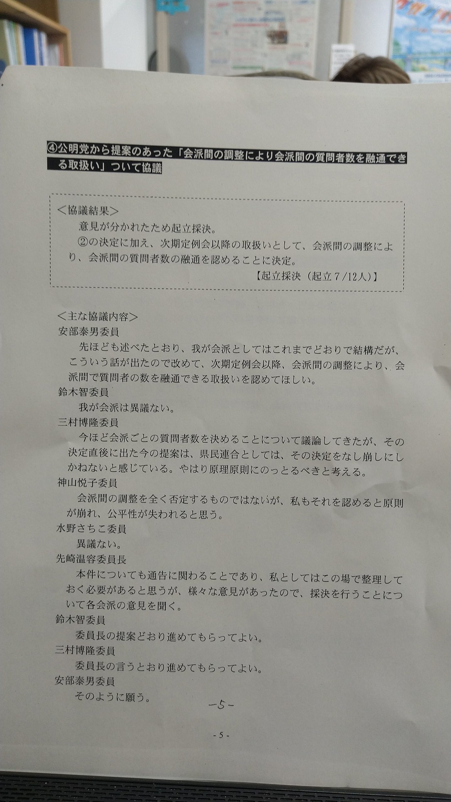 18日開催された福島県議会議会運営委員会は、年間の議員の一般質問を45人と決め、4人会派は年3回になることを、多数決で決定しました。今議会の質問通告は11人で、自民党が一人降りる形にしましたが、9月議会では4人会派は一般質問ができなくなります。しかし、公明党は会派間の調整は認めるべきと発言しこれをみとめ、自民党から一人枠を分けてもらって調整します(公明党だけが4人会派でも全議会で質問ができます)。これには県民連合も異を唱えました。